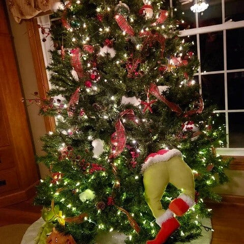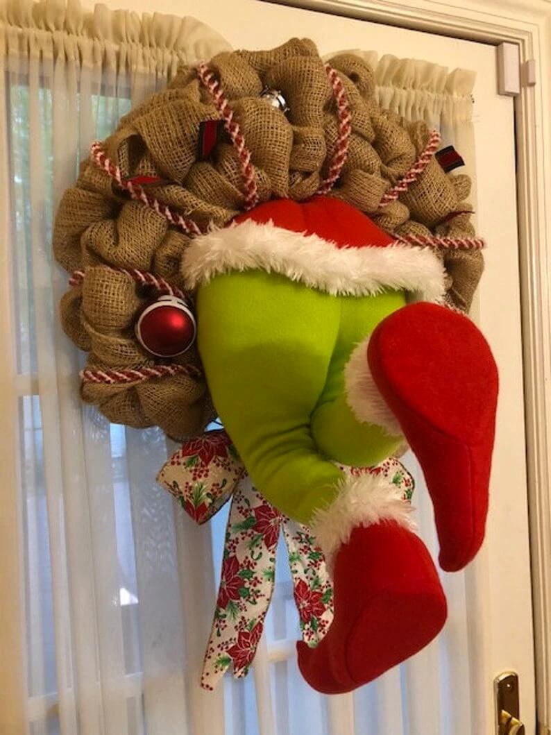 This Grinch inspired wreath will make anyone's heart grow three times in a day! Made with burlap ribbon to look like the Grinch's legs are poking out deep from within Santa's sack! With accents of red and white glitter Christmas ornaments, you can tell the Grinch is up to no good - and stealing Christmas - right on your front door! His plush legs are pose-able, so you can create your own Christmas scene on your wreath! The Grinch is cleverly disguised as Santa himself, to better trick the little Cindy Lu Who of Whoville - what a devil!